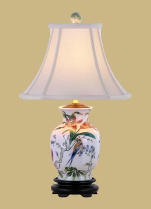 Add a refined new accent to your home with this lovely porcelain table lamp. It features a jar-shaped porcelain base decorated with tulip flowers and songbirds. An off white satin bell shade sits on top. With a three-way socket that allows for a variety of lighting options. Porcelain with tulip flower theme. Off white bell shade.