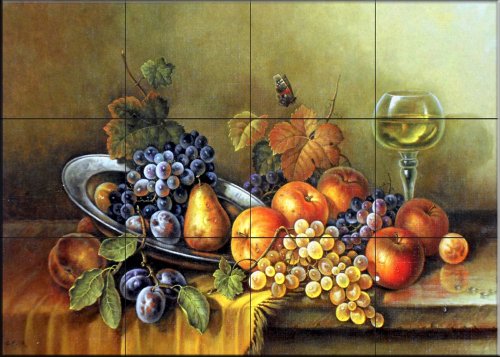 This beautiful artwork by Corrado Pila has been digitally reproduced for tiles and depicts a nice colorful fruit mural. Old world master tile murals are a great way to add something unique to your kitchen backsplash tile project. Make your tub and shower surround bathroom tile project exceptional with one of our decorative tile murals from an old world master painter. Our tile murals created from the original artworks of master painters are timeless and the perfect addition to any wall tile project.