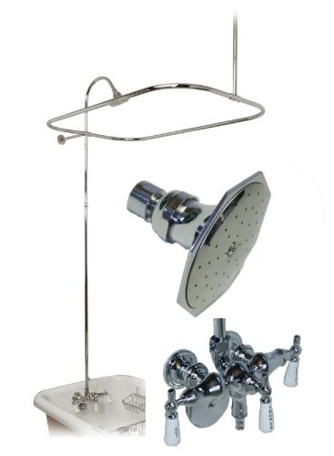 New in the box. Add-On Shower Unit with curtain Rod that will easily convert your claw foot tub into a shower. Complete with 3 3/8 inch brass diverter faucet.