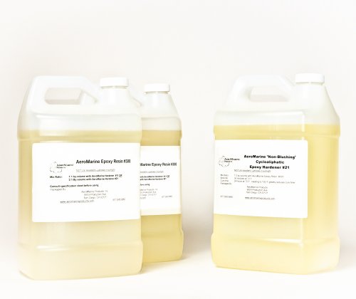 Clear Epoxy Resin. 3 Gallon Bartop Epoxy / Countertop Epoxy / Tabletop Epoxy. Total yield of 3 Gallons Clear Epoxy. Consists of two gallons of #300 resin and one gallon of #21 Non Blushing Cycloaliphatic Hardener. NOTE: Color in containers varies. However, the epoxy dries clear. Our best and most popular clear epoxy resin. It is ideal for most functions: Boat and aircraft building, poured countertops and general fiberglass and carbon fiber laminating. Great for building a 'Stitch and Glue' boat, Cedar strip kayak or canoe as well as for cold molded wood boat or fiberglass boats. This multifunctional epoxy is also used for pebble paving, pebble resurfacing, pebble repair, and pebble or stone decking. And automotive enthusiasts use it for laminating carbon fiber parts including hoods, dashes, etc. NOTE: Our epoxy is NOT UV resistant and will yellow in sunlight. The 1.5, 3 and 6 gallon kits are available with handy metering pumps. It is also useful for poured countertops, bar tops and table tops; and even making jewelry. The mix ratio is a simple 2:1 by either weight or volume. AeroMarine 300/21 is a thin, clear liquid. It has a working life of about 30 minutes, and sets hard in a few hours. Work life: 30 minutes@70F. Cure time: 24 hours@70F. NOTE: THIS PRODUCT IS NOT ELIGIBLE FOR AMAZON FREE SHIPPING.